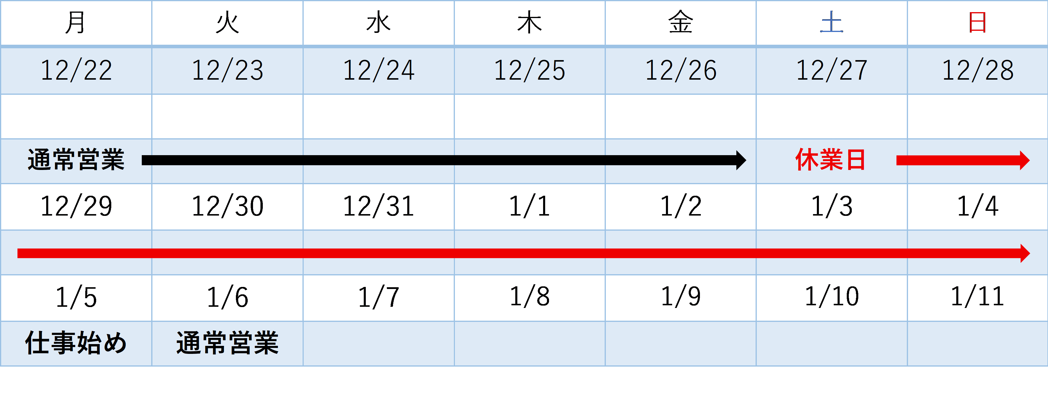 誠に勝手ではございますが、年末年始の営業日につきまして下記の通りお知らせいたします。 なお、1月5日(月)は別会場にて仕事始めの式・会議を行うため、社内不在となっております。 1月6日(火)より通常通り営業を再開いたします。